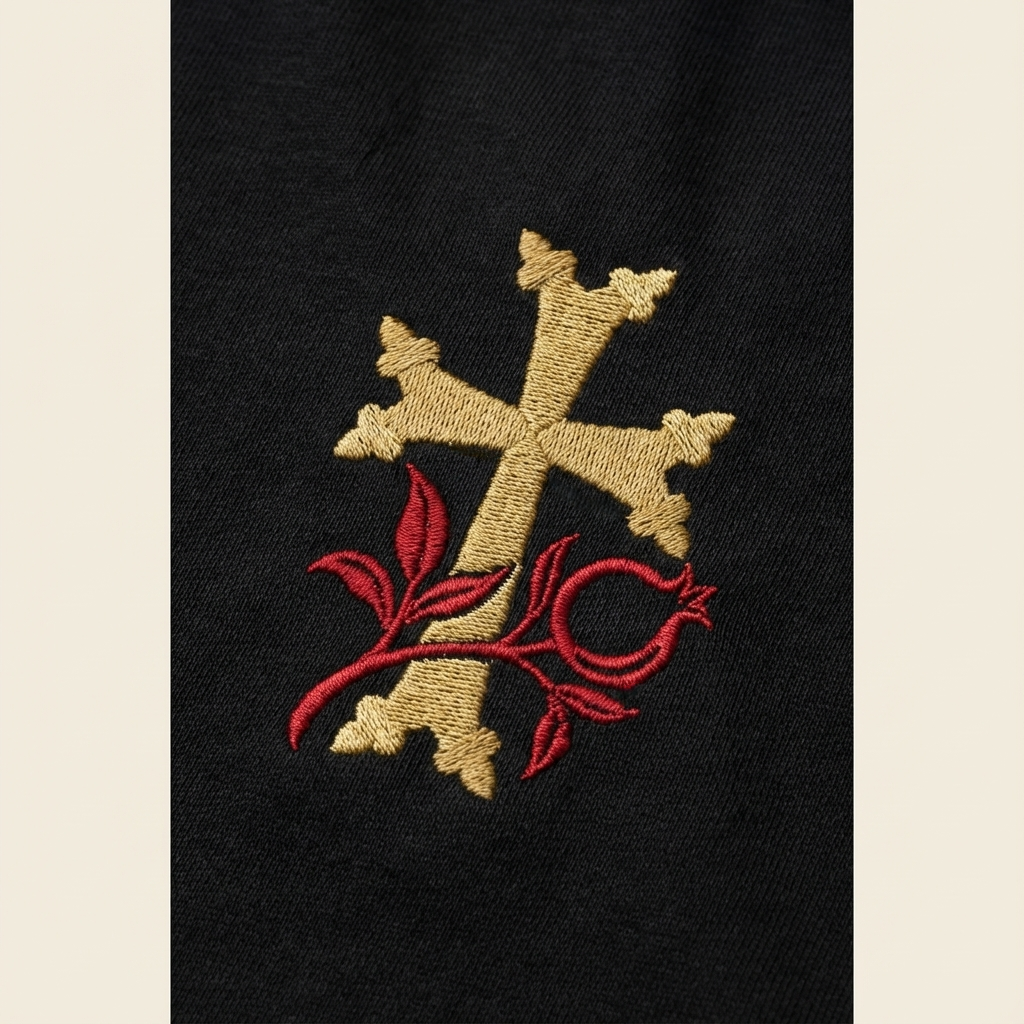 A premium heavyweight tee featuring the Khachkar Pomegranate motif, drawn from Armenian stone and textile traditions. Cut with a structured, balanced fit, the fabric has enough weight to hold its shape while remaining soft against the skin.